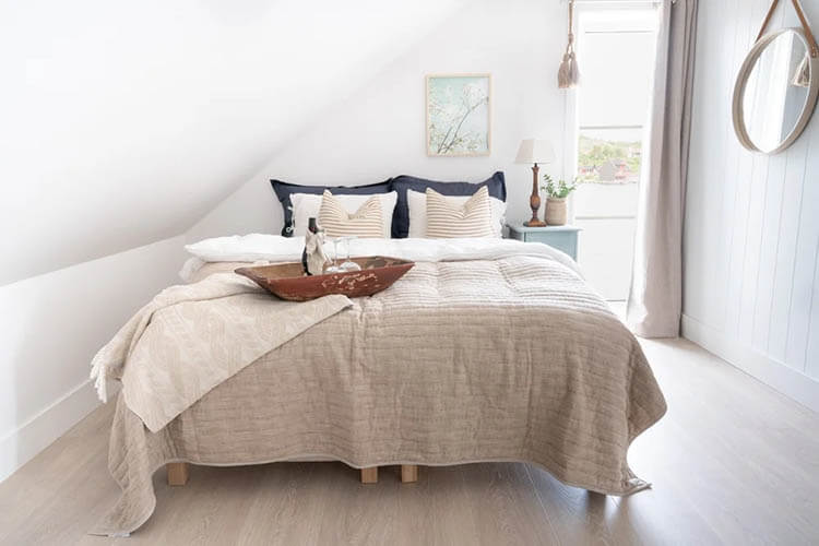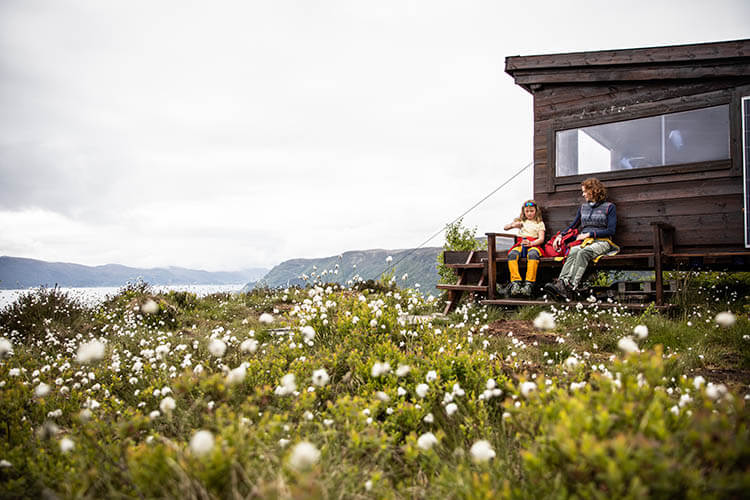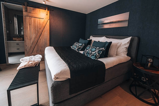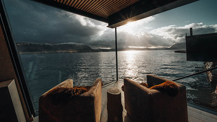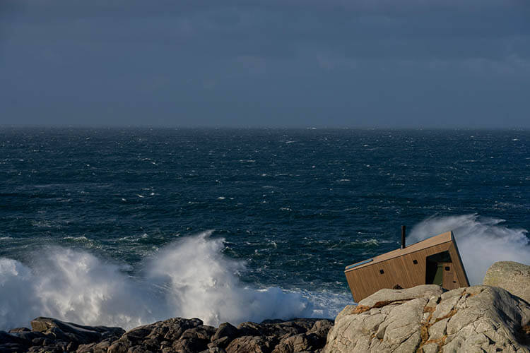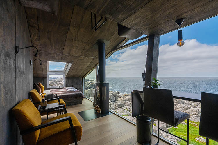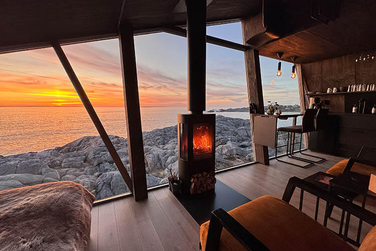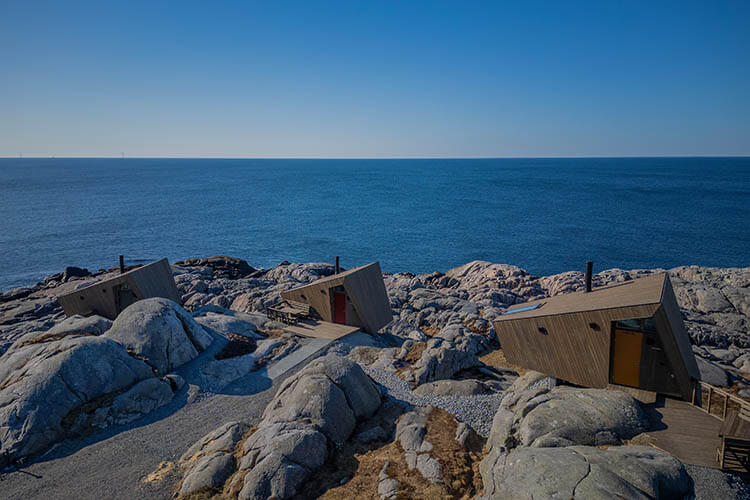 Weiter geht es Richtung Norden. Direkt am Wasser gelegen bieten diese stilvollen Cabins modernsten Komfort und atemberaubende Panoramablicke. Die Häuser mit Panoramafenstern liegen direkt am äußersten Felsrand. Hier genießen Sie die Aussicht über das Meer, während die Wellen gegen die Felsen schlagen. Jede Cabin ist individuell gestaltet und spiegelt die raue Natur an der Westküste Norwegens wieder. Durch die großen Fenster ist eure Übernachtung hier bei jedem Wetter ein Highlight. Etwa zehn Minuten zu Fuß entfernt liegt ein weißer Sandstrand, der im Sommer zum Baden einlädt. Wanderwege entlang der Moore und Fahrradwege säumen die Insel.