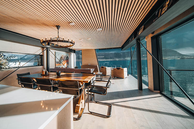 Diese Lodge vereint Luxus und Abenteuer: Direkt am Fjord gelegen, bieten die drei Ferienhäuser modernsten Komfort und spektakuläre Aussichten. Familien können hier mit dem Motorboot unterwegs sein, die Kajaks oder SUP-Boards nutzen, am Lagerfeuer Stockbrot backen oder einfach die Stille genießen. Die Lodge ist ideal für Ausflüge in die umliegenden Fjorde und Berge. Ein unvergesslicher Ort für gemeinsame Momente!